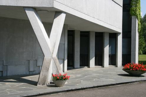 die im Innern schlicht gestaltet ist, aber im Äußeren als Wand über dem Eingang eine dezente Betonung durch drei horizontale Absätze erhielt. Sie bildet, wie ein Schiffsbug hervorragend, gewissermaßen das Vordach für den Eingangsbereich. Eine noch stärkere Betonung erfährt dieser Bereich durch die X-förmige, an das Andreaskreuz erinnernde Stütze und das Relief an der Außenwand des Vorraumes.