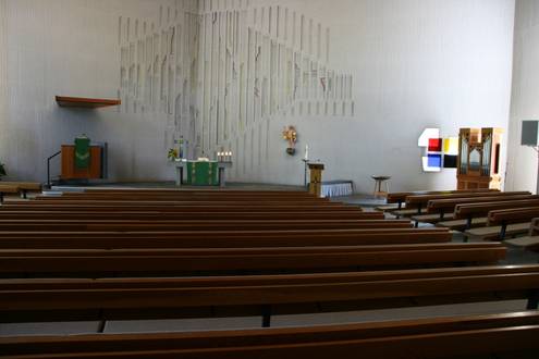 In diesen Kreis fügen sich die unregelmäßig gefalteten Wände ein, wobei die Wandscheiben der Nord-, West- und Südwand einerseits gewissermaßen die Gemeinde umschließen, aber den Blick zum Altarraum hin öffnen, der von einer breit gespannten, in der Mitte abgewinkelten Wand abgeschlossen wird. Ein großflächiges abstraktes Relief soll diese Wand "in ihrer Bedeutung über die anderen Wände hinausheben" (Prof. Döcker).