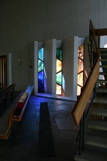 Im Gegensatz dazu ist die Südwand - bis auf kleine farbige Fenster im unteren Bereich - geschlossen und verhindert damit eine direkte Sonneneinstrahlung in den Raum. Diese erzeugt nämlich je nach Jahreszeit, Stunde und Wetter die unterschiedlichsten Lichtarten und -richtungen und kann dadurch das Raumbild tiefgreifend verändern. Die Gleichmäßigkeit der Raumbelichtung ist aber ein wichtiger Beitrag zu der erwünschten ruhigen Atmosphäre des Kirchenraumes und dabei sollten die Zufälligkeiten direkten Sonnenlichts ausgeschlossen werden.