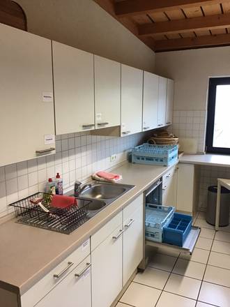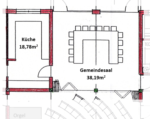Die direkt angrenzende Küche mit 19m2 kann dazu gebucht werden. Die Zugänge zum Gemeindesaal, zur angrenzenden Küche und auch die Türen zum Freigelände sind barrierefrei.