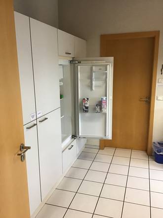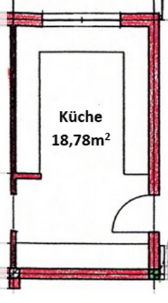 Die Küche hat eine Fläche von 19m2. Sie ist mit Kühlschrank, Elektroherd, Handspülbecken und Industriespülmaschine ausgestattet.