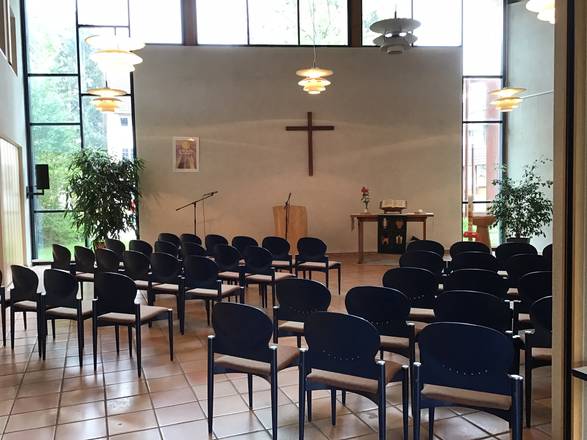Bestuhlt für Vortragsveranstaltungen finden im Gemeindsaal bequem dreißig bis vierzig Personen Platz. Bei engerer Stuhlung auch mehr.