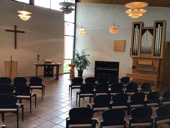Der Kirchenraum ist barrierefrei erreichbar. Für den Gottesdienst bestuhlt, bietet er geräumigen Platz für fünfzig bis sechzig Gottesdienstbesuchende.
